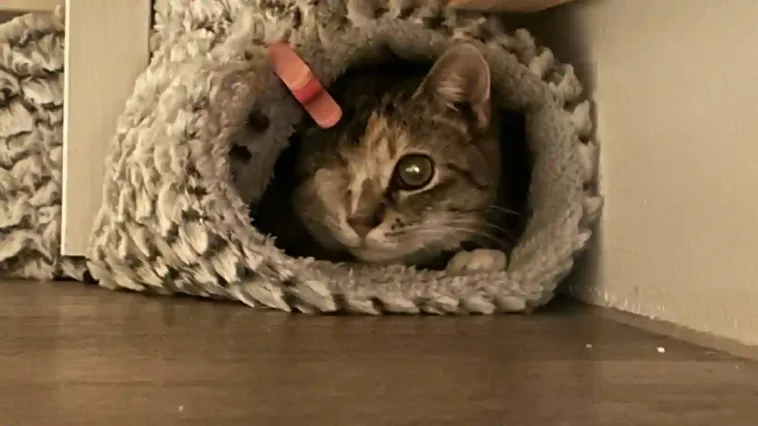 Already a loving cat mom to three other shelter kitties, all with past traumas of their own, she knew how to create a home where a hurting animal could just be. She brought the tiny one-eyed kitten home and let her choose her hiding places—first under furniture, then behind the washer, and eventually… behind curiosity.
