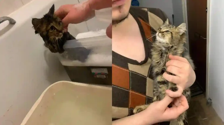 The little cat had been surviving among trash bins; her fur matted so badly she couldn’t walk. Bottle caps, shards of metal, and old litter were tangled deep in her coat.